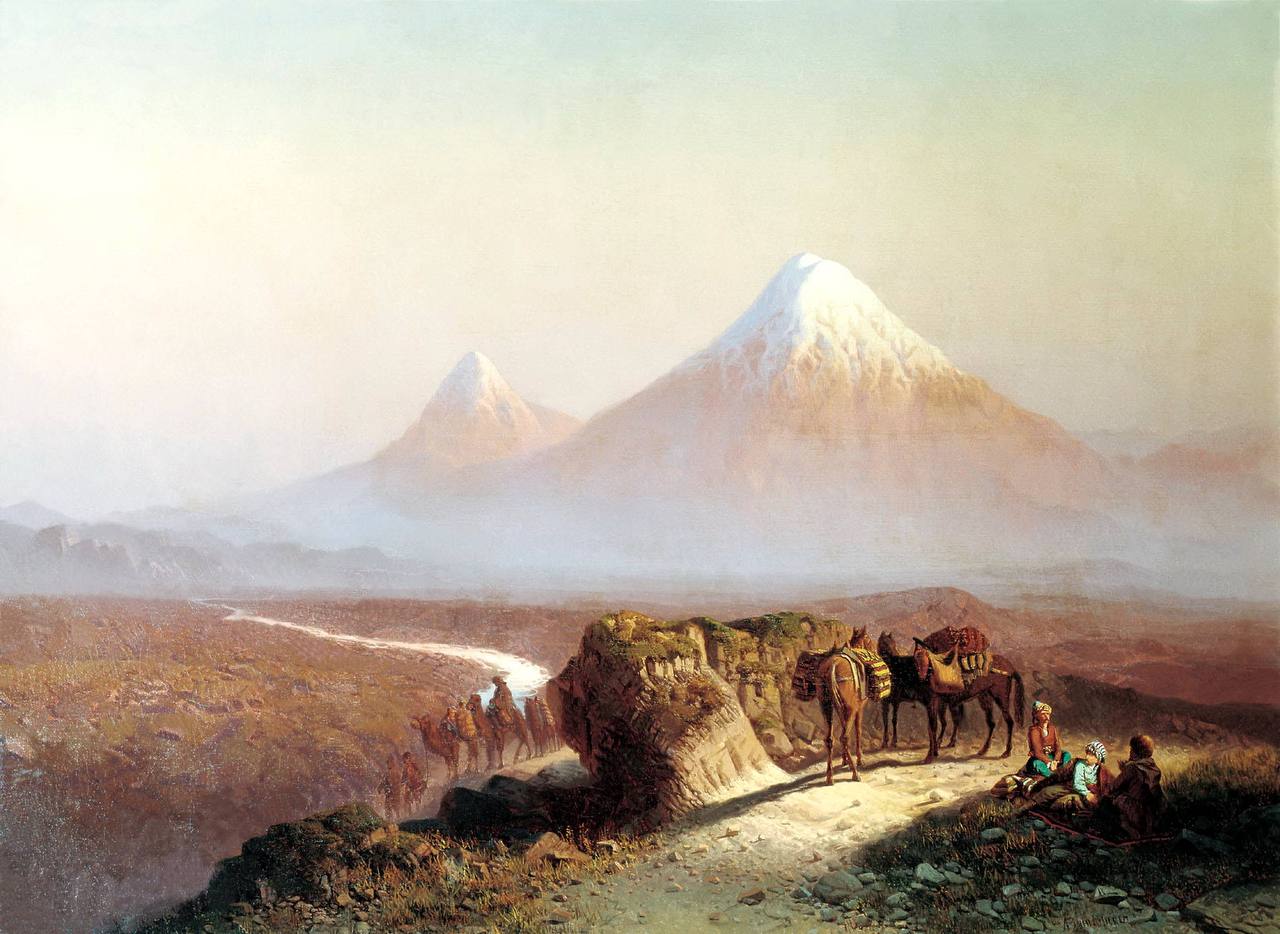منظره آرارات در سال 1894 متاثر از سنت های چشم انداز آکادمیک است. آب رودخانه ای که در دوردست می ریزد انگار تمام رنگ های رنگین کمان را جذب کرده است. منظره به طور کلی کاملاً رنگارنگ به نظر می رسد، رنگ فعال و جذاب فقط با مه یاسی آرام می شود. مردم نیز در پیش زمینه به تصویر کشیده می شوند، اما این بار هنرمند آنها را چندان فعالانه برجسته نمی کند. رد نسبی این تکنیک باعث می شود تصویر کمتر نمایشی باشد و نورپردازی طبیعی تر به نظر برسد. حالا نگاهمان به مسافران نمی ماند. خطوط کلی قلههای آرارات در هوا گم میشود، پرتوهای خورشید سحر بر آنها میتابد. زانکوفسکی به پرسپکتیو هوای نور و انتقال رنگ ملایم توجه زیادی دارد