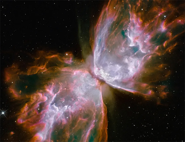 اشکال رنگارنگ و بال مانند NGC 6302 به آن نام رایج «سحابی پروانه» یا «سحابی حشره» داده است. بالهای متمایز جسم زمانی ایجاد شدند که یک یا چند ستاره در مرکز آن به طور دورهای لایههای بیرونی خود را بیرون میاندازند. گاز در چند هزار سال گذشته در این مناطق داغتر از 36000 درجه فارنهایت هستند و گرمتر می شوند. در عرض سه سال نوری! ستارگان مرکزی پرتوهای فرابنفش می تابند که باعث می شود مواد ریخته شده به نظر برسد درخشش سحابی پروانه در فاصله 2500 تا 3800 سال نوری از ما در صورت فلکی عقرب قرار دارد. این تصویر نزدیک به ماوراء بنفش تا مادون قرمز نزدیک، الگوی تازه کشف شده تابش مادون قرمز نزدیک را برجسته می کند. شکل S را از سمت چپ پایین به سمت راست بالای سحابی ترسیم می کند که از سیستم ستاره مرکزی می گذرد. این خط انتشار از آهن یونیزه شده است، عنصر سنگینی که در زمان همجوشی هسته ای منظومه ستاره ای ایجاد می شود. گاز S شکل بیش از 600000 مایل در ساعت! بسیار سریعتر از انتشار گازهای اطراف که با سرعت حرکت می کنند پیشروی می کند.