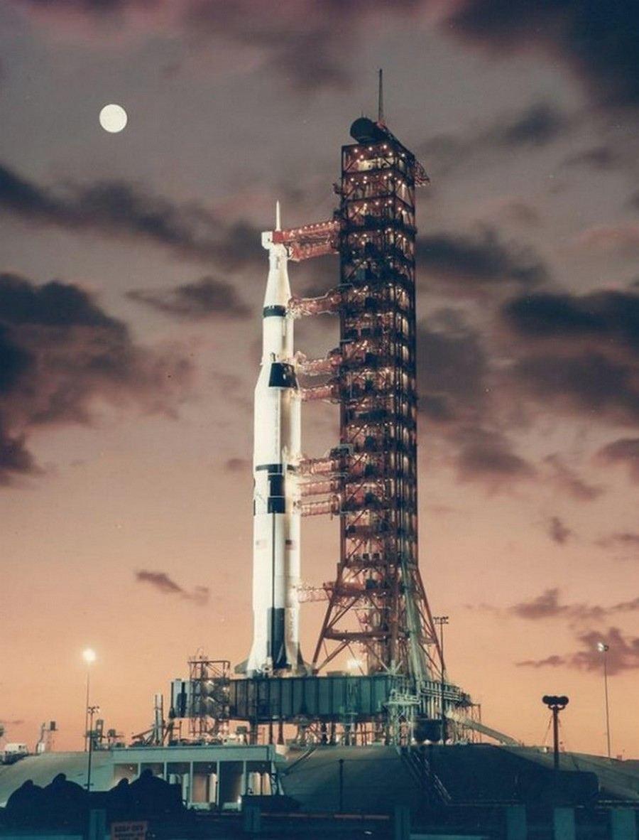 تصویر، موشک غولپیکر ساتورن 5 را نشان میدهد که در تاریخ ۹ نوامبر ۱۹۶۷ در پایگاه فضایی کندی ناسا در فلوریدا آماده میشد تا برای اولین بار به فضا پرتاب شود. این پرتاب آزمایشی که به نام «آپولو ۴» شناخته میشود، یک مأموریت بدون سرنشین بود که هدف آن آزمایش موشک و فضاپیمای آپولو در شرایط پرواز واقعی بود.