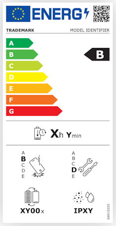 بنابراین، از 20 ژوئن 2025، باتریهای دستگاههای تلفن همراه و تبلتها باید اطلاعاتی در مورد بهرهوری انرژی، دوام، مقاومت در برابر آب و گرد و غبار و توانایی مقاومت در برابر سقوطهای تصادفی خود را نشان دهند. این اولین باری است که محصولی که در بازار اتحادیه اروپا عرضه میشود، باید برچسبی را به نمایش بگذارد که از نظر شماتیک میتواند مانند برچسبهای روی یخچالها باشد، با امتیاز طراحی زیستمحیطی که سهولت تعمیر را اندازهگیری میکند.