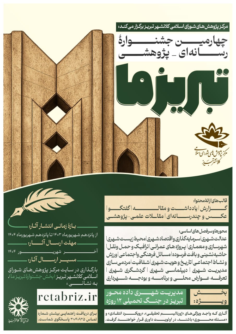 چهارمین جشنواره رسانهای–پژوهشی «تبریز ما» با پایان داوری آثار و معرفی برگزیدگان، روز سهشنبه ۲۷ آبان به کار خود پایان میدهد. امیر دهقان، دبیر چهارمین جشنوارۀ رسانهای_پژوهشی «تبربزما» در گفتگو با خبرنگاران گفت: در این دوره در مجموع ۶۲۲ اثر از پژوهشگران، روزنامهنگاران و فعالان رسانهای به دبیرخانه جشنواره ارسال شده بود. پس از ارزیابی اولیه توسط هیئت انتخاب، ۳۹۸ اثر برای داوری نهایی انتخاب شد که شامل ۲۲ مقاله علمی–پژوهشی، ۱۷۴ اثر رسانهای و ۲۰۲ اثر در بخش عکس و چندرسانهای بود. هیأت داوران هر بخش بهصورت مستقل و در دو مرحله آثار را بررسی کرده و در نهایت، آثار برگزیده چهارمین دوره جشنواره رسانهای–پژوهشی «تبریز ما» را معرفی نمودند. دهقان افزود: آیین اختتامیۀ چهارمین جشنوارۀ رسانهای_پژوهشی «تبریزما» روز سهشنبه ۲۷ آبان ساعت ۱۵:۳۰ در سالن بعثت دانشگاه هنراسلامی تبریز برگزار میشود