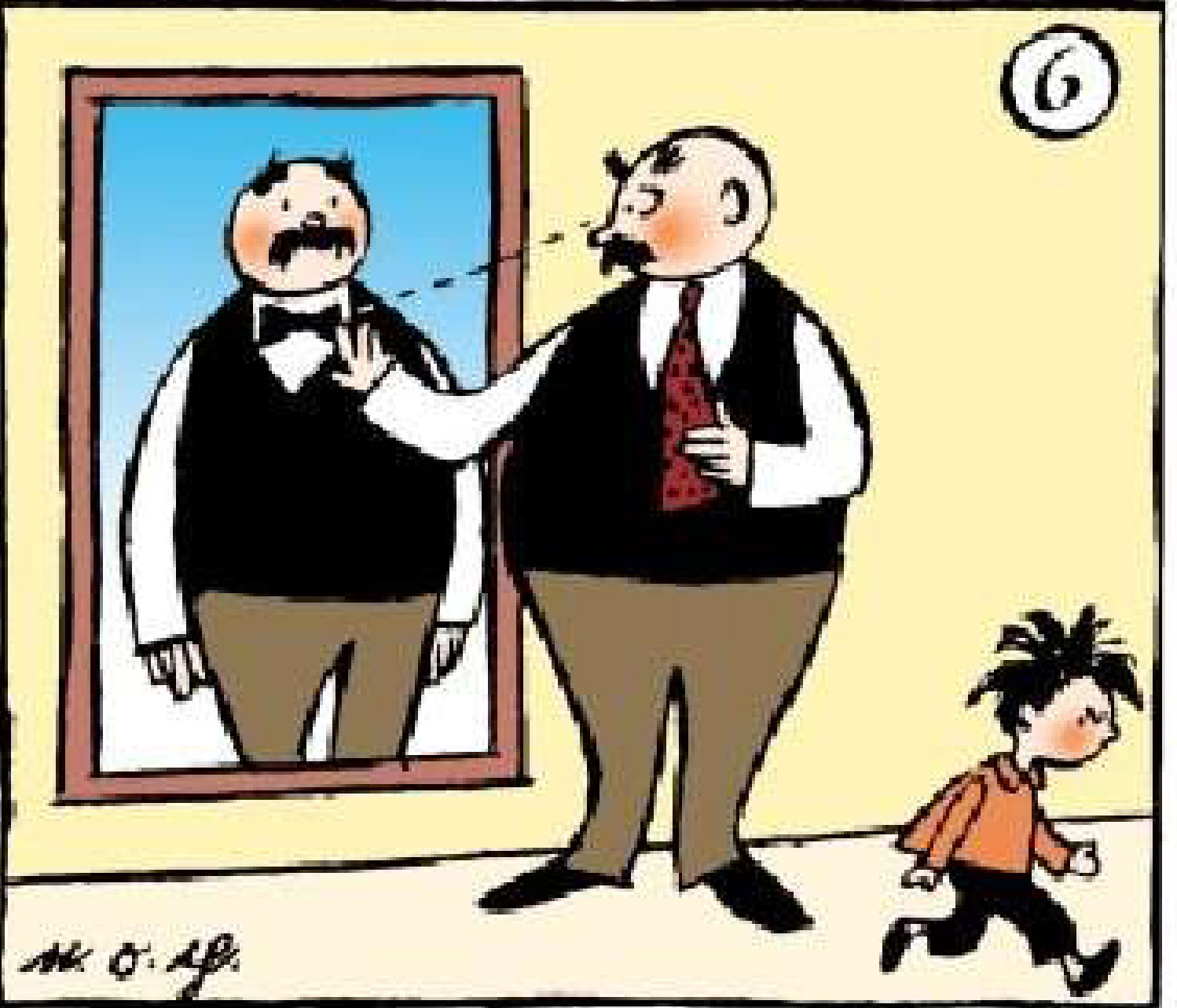 در خانه مشغول بازی بودم ، با چوب هاکی می خواستم توپ را بزنم که ناگهان چوب به آینه ی تمام قد روی دیوار برخورد کرد! آینه شکست و تکه هایش روی زمین ریخت ! خیلی ترسیده بودم ؛ چکار می توانستم بکنم ! بقیه شیشه ها را شکستم و همه چیز را تمیز کردم ! حالا نوبت نقاشی تصویر بابام در جای خالی تابلو بود. نقاشی را تمام کرده بودم که بابام سر رسید ، در حال گره زدن کراواتش بود که ناگهان متوجه شد که در تصویر آینه به جای کراوات ؛ او پاپیون دارد ....کاری نمی شد کرد مگر آنکه یواشکی زد به چاک !