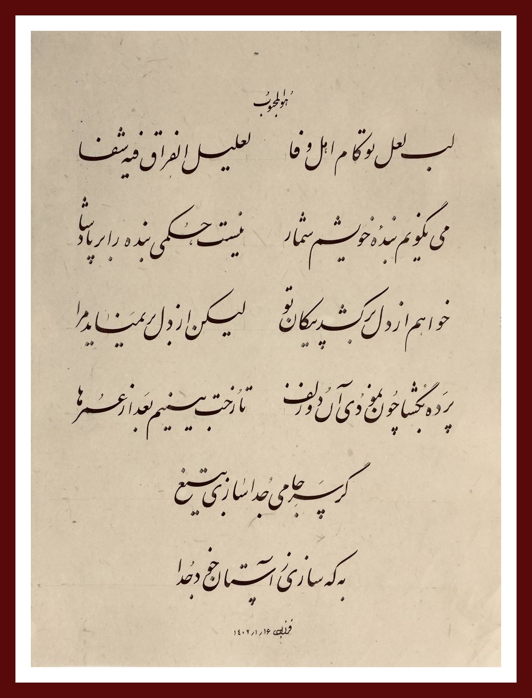 تصویر حضرت استاد درویش عبدالمجید که توسط محمدهادی، تذهیبکار و نگارگر زمان خود درویش کشیده شده است و درویش با خط زیبای خود زیبایی آن را دو چندان کرده است گر کسی عاشق رخسار تو باشد چکند طالب دولت دیدار تو باشد چکند شوخی و بی خبر از درد گرفتاری عشق دردمندی که گرفتار تو باشد چکند