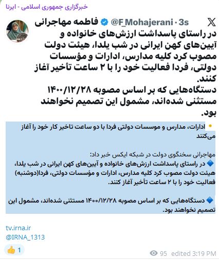 در روز چهارشنبه، فعالیت مدارس شهرستانهای تبریز، اسکو، عجب شیر، آذرشهر، بناب و دو بخش (مرکزی شبستر و صوفیان) در مقاطع پیش دبستانی تعطیل و مقاطع تحصیلی ابتدایی شیفت صبح و بعد از ظهر به صورت غیرحضوری و در بستر شاد انجام شود. امتحانات مقطع دبیرستان مدارس برگزار و طبق روال عادی خواهد بود. دانشگاهها، مراکز آموزش عالی و ادارات در سطح استان به روال عادی دایر و فعالیت خواهند نمود. مقرر شد گشت و کنترل برای تداوم تعطیلی موقت کارخانههای آلاینده در حاشیه شهرهای ذکر شده آلوده تداوم داشته باشد.