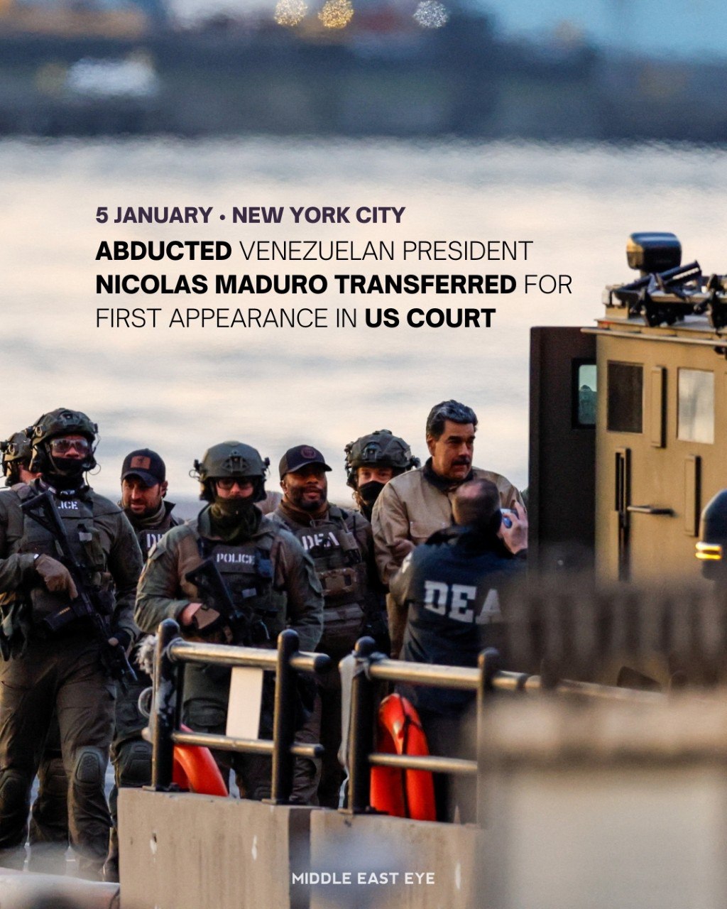 مقامات اجرایی قانون ایالات متحده، نیکلاس مادورو رئیسجمهور ربودهشده ونزوئلا را برای حضور اولیه در دادگاه فدرال ایالات متحده دانیل پاتریک موینهان در منهتن، در روز دوشنبه منتقل کردند.نیروهای ویژه ایالات متحده، مادورو را اوایل روز شنبه از کاراکاس ربودند، در حالی که جتهای جنگنده آمریکایی پایگاهها و تأسیسات نظامی کلیدی در سراسر کشور را بمباران کردند.مقامات آمریکایی اعلام کردند که رهبر ونزوئلا در ایالات متحده به اتهام قاچاق مواد مخدر محاکمه خواهد شد، در حالی که رئیسجمهور دونالد ترامپ اظهار داشت کشورش ونزوئلا را «برای آینده قابل پیشبینی اداره خواهد کرد».